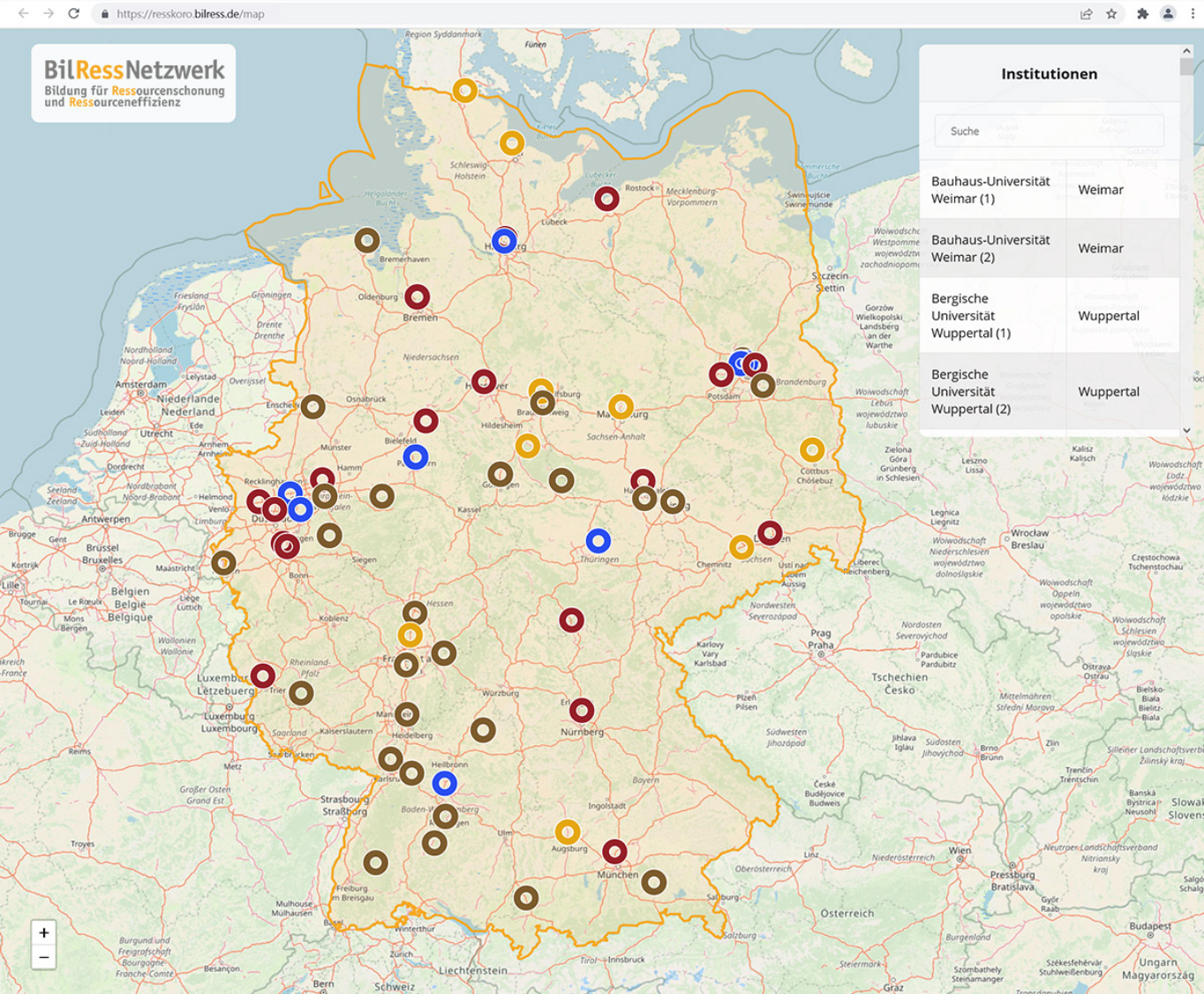 In BilRess wurden verschiedene Module bearbeitet, um die Bildung für Ressourcenschonung und Ressourceneffizienz zu verbessern und zu unterstützen. In dem Modul „Orte der Umweltbildung“ wurde zum einen ein Beratungskonzept für diese Ort entwickelt, und zum anderen eine „Interaktive Karte“ mit rund 100 Orten der Umweltbildung erstellt, die sich unter anderem der Ressourcenbildung widmen (oder gewidmet haben). Diese Institutionen wurden mittels einer Web-Recherche identifiziert oder sind Mitglieder im BilRess-Netzwerk. Es wurden die folgenden Datenbanken durchsucht: