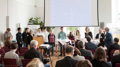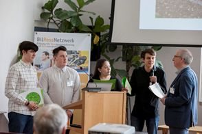 Im Anschluss präsentierten Schüler*innen der integrierten Gesamtschule Ernst Bloch aus Ludwigshafen ihre vielfältigen Aktivitäten zum Ressourcenschutz. Die Schüler*innen berichteten, wie an ihrer Schule der Ressourcen- und Umweltschutzgedanke bereits in den unteren Klassen gefördert wird. Dies geschieht vor allem durch Projekte, die von ihrer engagierten Lehrerin Monika Juchheim und den Schüler*innen der oberen Klassen angestoßen bzw. ermöglicht werden und dann mit viel Motivation weitergetragen werden. Zum Beispiel entwickelte eine 5. Klasse einen “Wasser-sparen”-Rapp, es gab einen Wettbewerb zum richtigen Heizen und Lüften, aus Platinen wurden Gebrauchsgegenstände wie z. B. Haarklammern hergestellt und im Schulgarten wurden – im interdisziplinären Ansatz – nicht nur Mischkulturen von Kürbis, Bohne und Mais im Milpa-Beet erfahrbar gemacht, sondern auch eine Vielzahl von verschiedenen Kartoffelsorten angebaut und damit zusätzlich u. a. Historie und Kultur der Kartoffel erforscht.